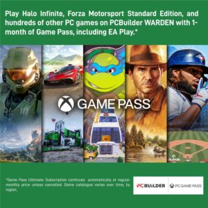 The PCBuilder WARDEN Windows 11 Gaming PC also includes one month of PC Game Pass, including EA Play. Play over 100 high-quality PC games, in various genres such as Halo Infinite, Forza Horizon 5, and Minecraft on your new gaming rig. With new games added all the time, there’s always something new to play from day one.